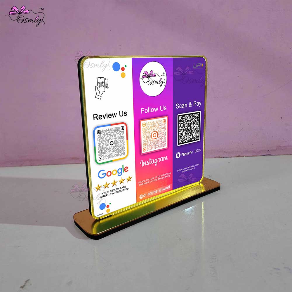 Custom Google, Instagram, Phone QR Stand gold acrylic border, UV printed, single/double-sided, 6/8/11 inch, waterproof, glossy finish